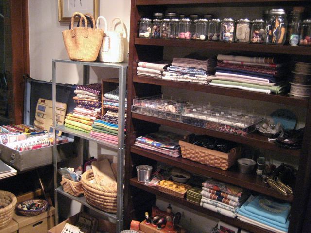 天井まで届く棚、そこにぎっしり並べられたボタンや手芸用品や生地、