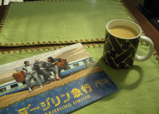 目一杯カップに注いだミルクティーと映画『ダージリン急行』のパンフレットで。