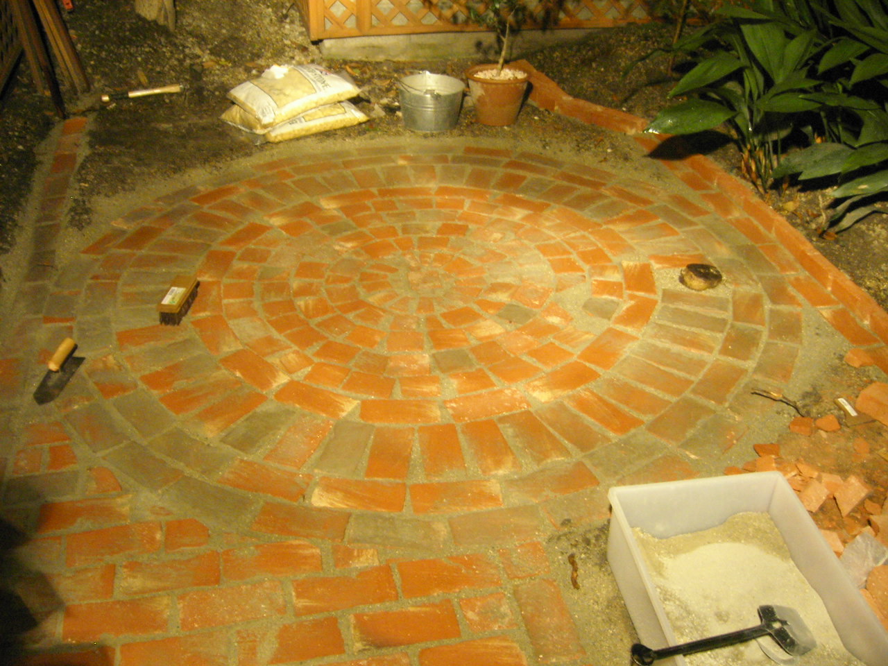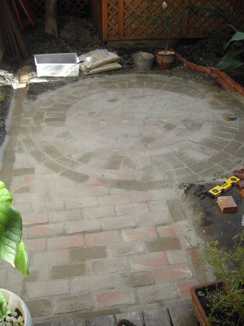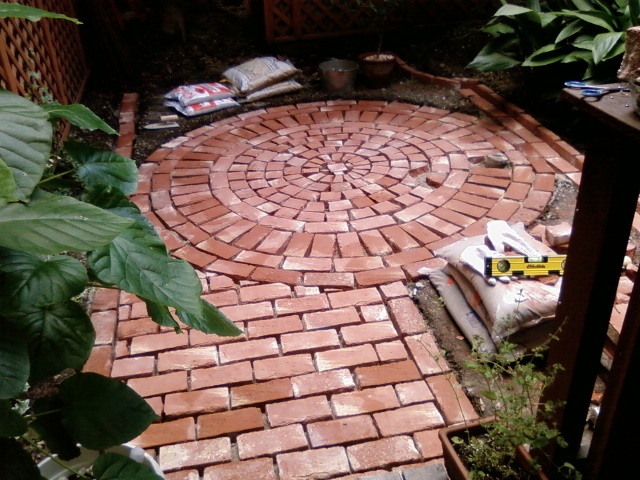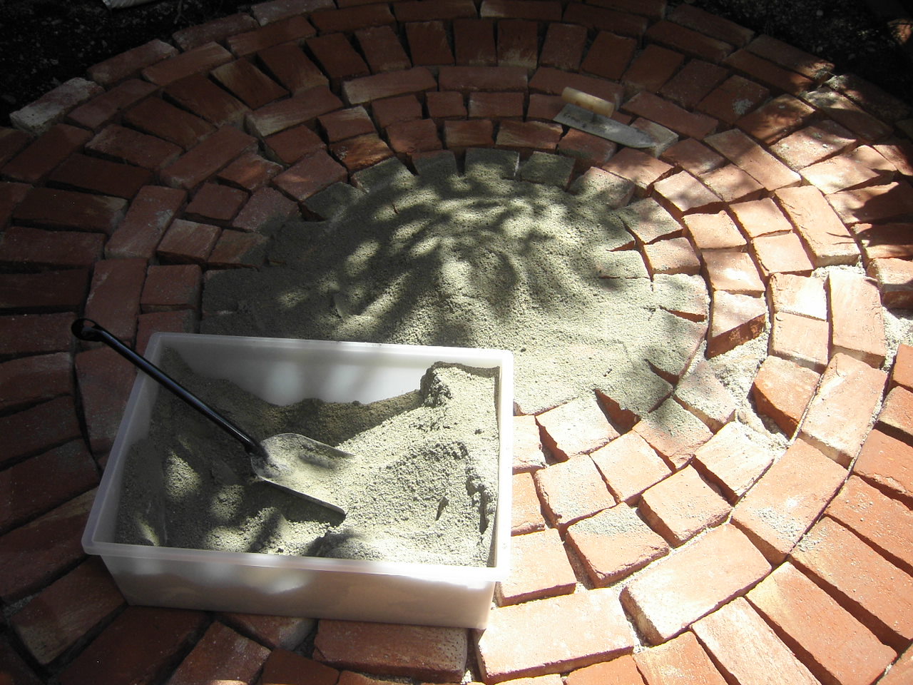 花壇の煉瓦にモルタルを埋め込み、最終お楽しみの水撒き。
